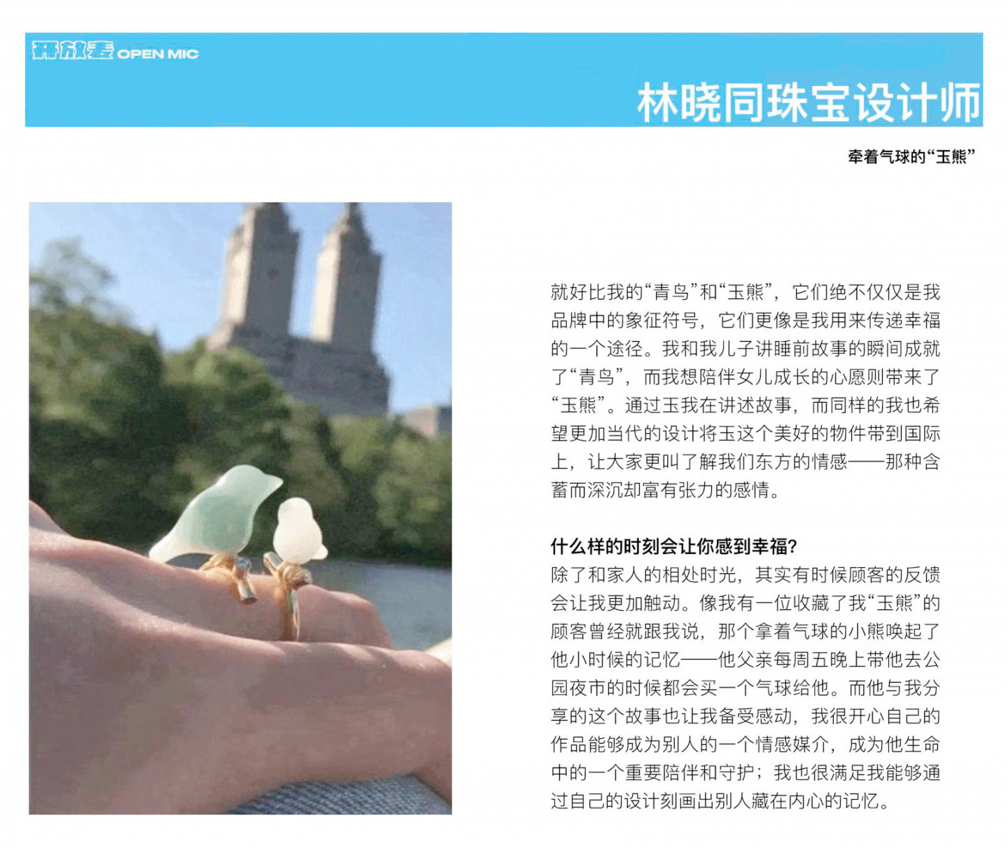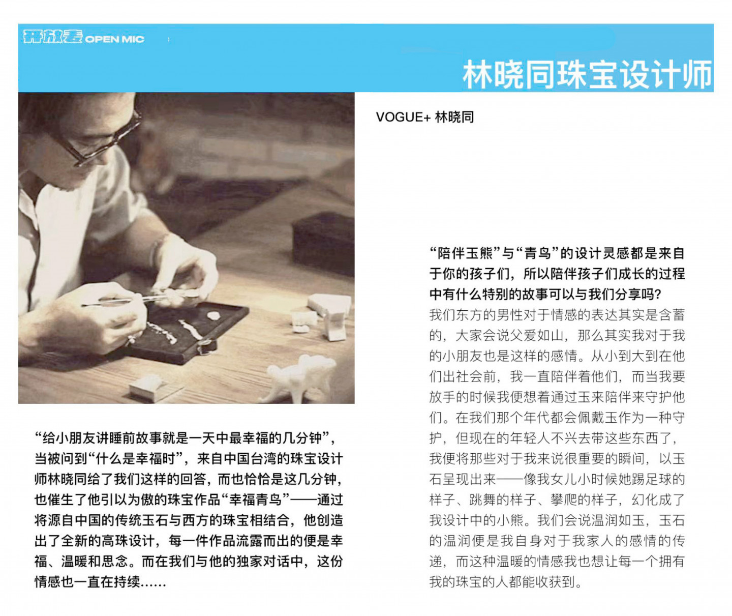 ——2023年金秋,林晓同珠宝北京旗舰店正式进驻侨福芳草地购物中心,中国版VOGUE+在开幕期间独家专访林晓同设计师。从对于幸福定义的探索开始,带领读者完整探索品牌经典系列「幸福青鸟」、「陪伴玉熊」的诞生故事。
