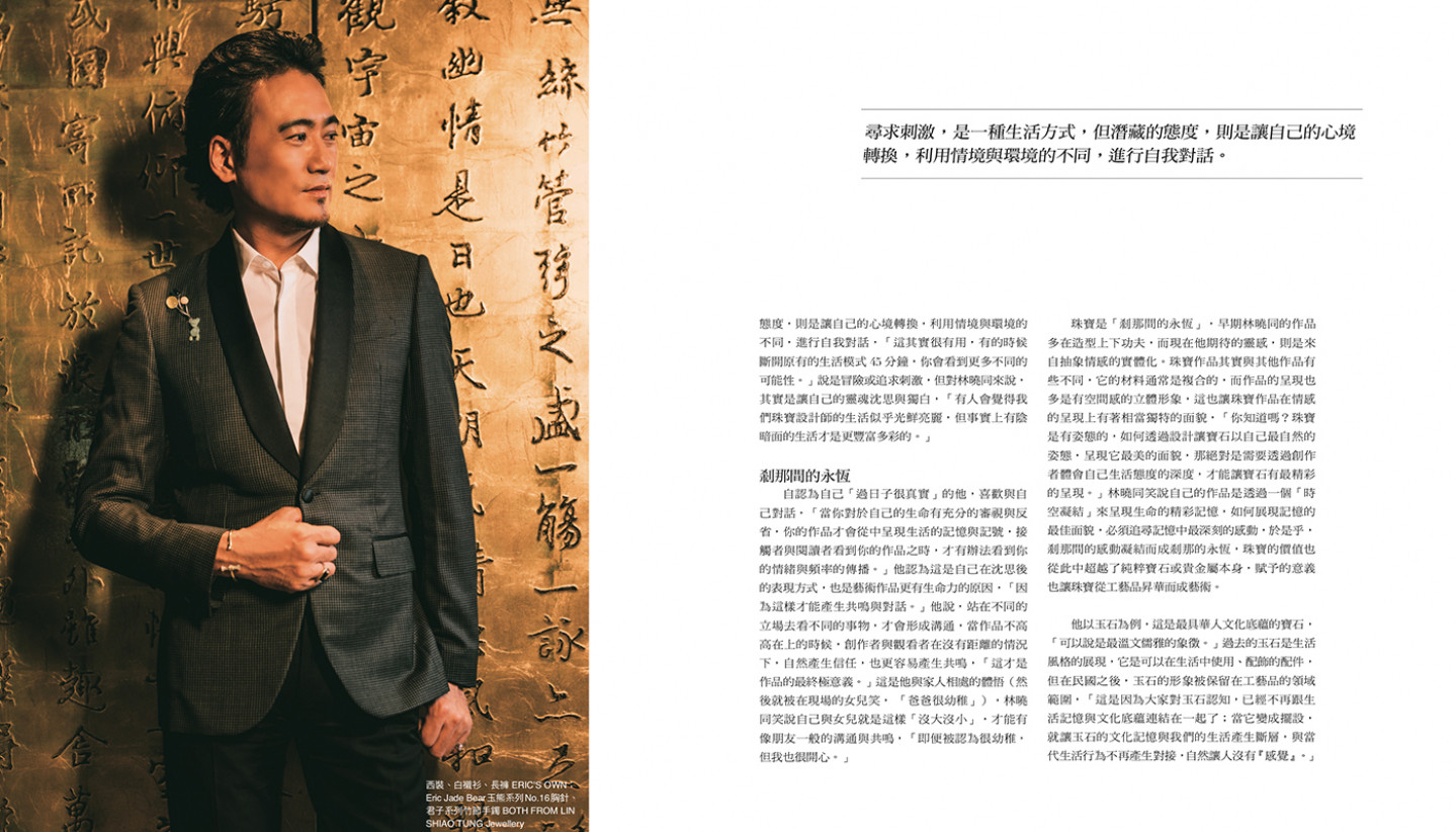 Lin Shiao Tung's jewellery design philosophy centres around the principle of simplicity, and seamlessly combines commercial and artistic elements, employing a pure and authentic approach that encapsulates his unique "life attitude".